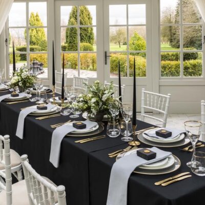 Why not celebrate your summer offering with a cornfield gold tablecloth and rose blush napkins or put an icy edge on your Christmas afternoon tea with a pebble grey base and Cambridge blue runner?
