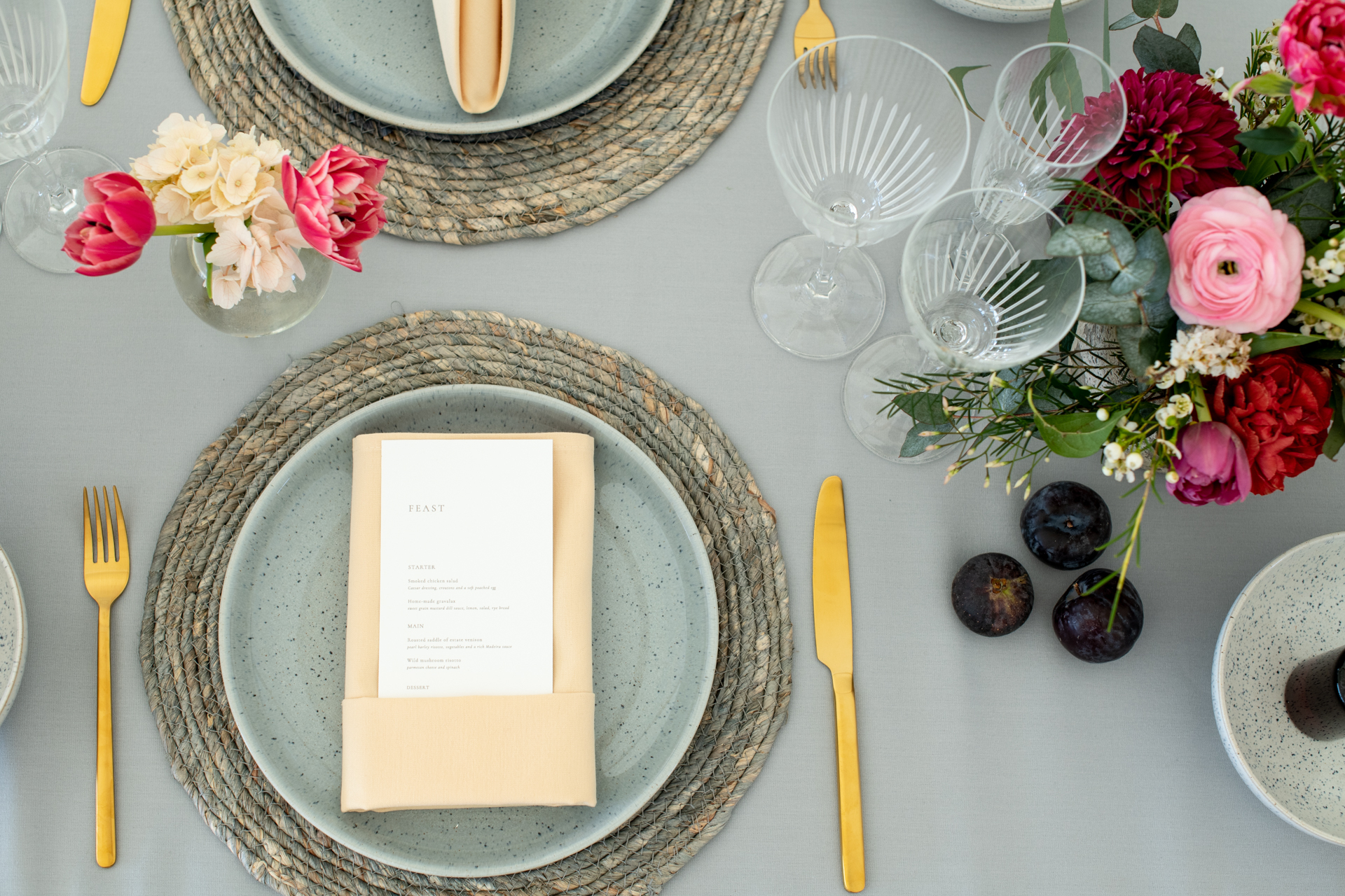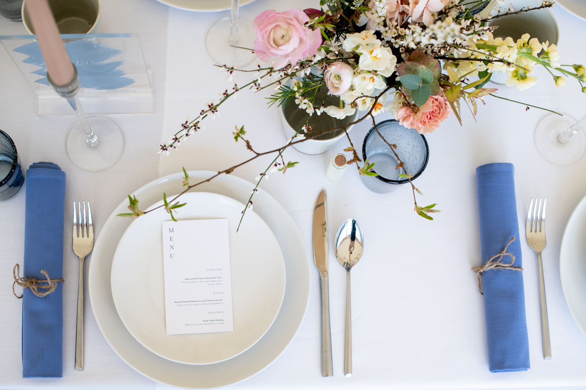 Don’t overlook your menu when choosing how you decorate your table! Let your menu influence the colours and styles you pick, making sure they complement each other.