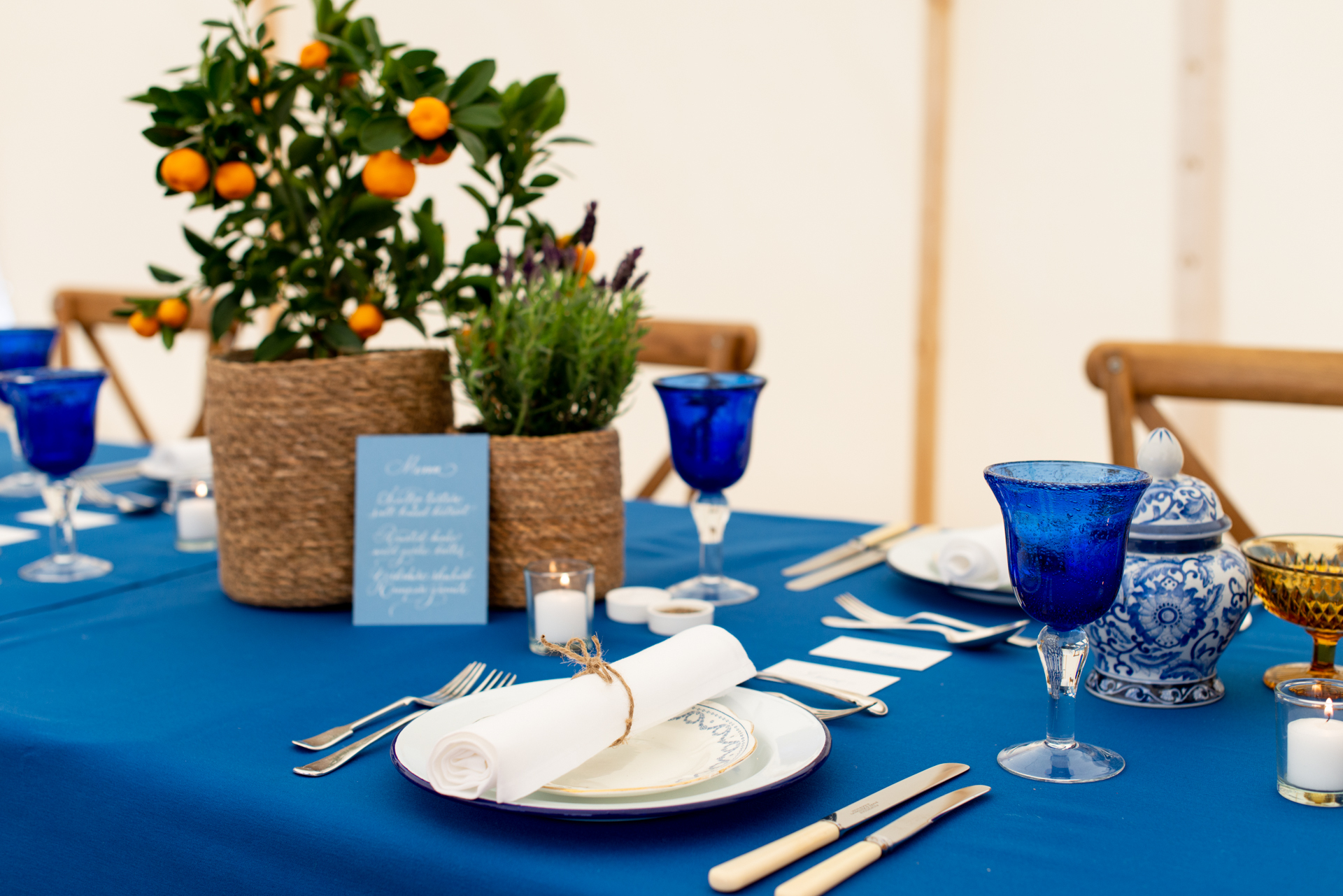 For a more dramatic impact, choose Royal Blue table linen paired with Arctic White napkins and decorate tables with bright orange flowers for a summery pop of colour.