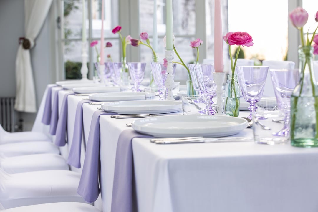 Mint Green table linen paired with Wild Fuchsia napkins will really stand out, as will Mandarin Orange paired with Pebble Grey. Pair with flowers of deep, vibrant colours and coloured glass ware for midsummer feasts.